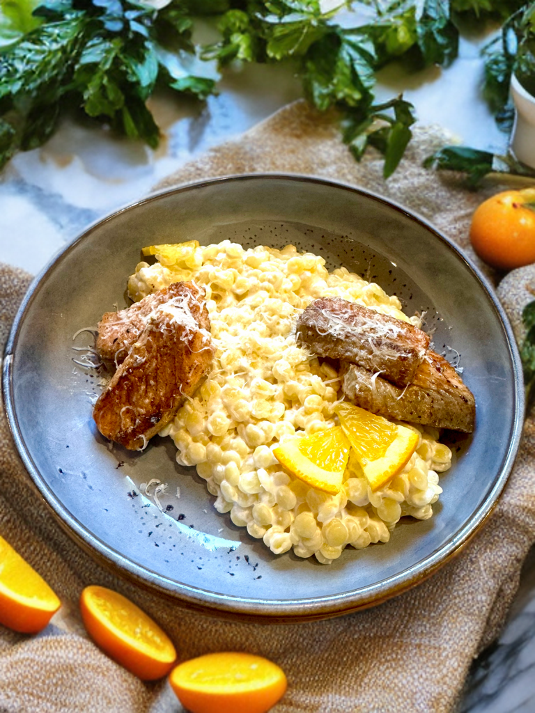 Паста птитим в сливочном соусе, форель, обжаренная на апельсиновом масле, с добавлением сыра пармезан.
