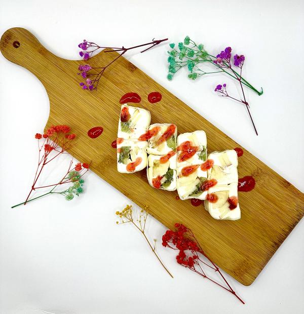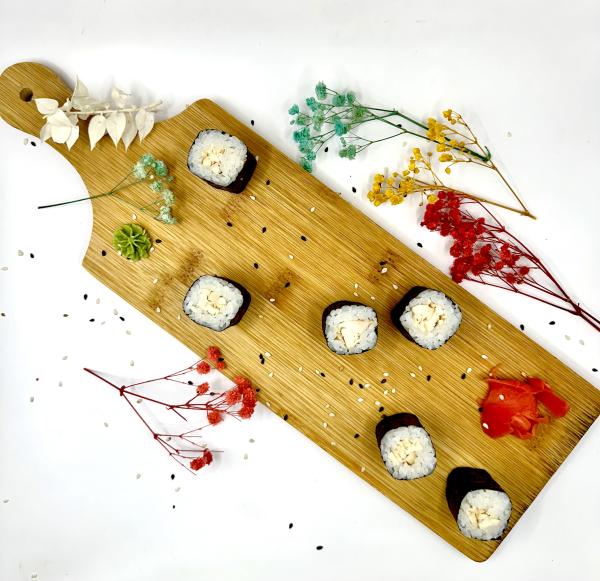 Рис, нори, сыр, помидор, крабовая палочка, кунжут, соус масаго, соус унаги.
